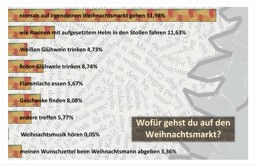 Das bestätigt auch das Gesamtergebnis. Mit fast 52 Prozent bildet die Mehrheit jene Fraktion, die Weihnachtsmärkte in Leipzig oder anderswo konsequent meidet. Glühwein – egal ob rot oder weiß – bewegt immerhin fast 14 Prozent dazu, sich ins Gedränge zu stürzen. Für die Weihnachtsmusik hingegen reicht es gerade für 0,05 Prozent. Und nach dem heutigen Tag dürfte der Wunsch nach Weihnachtsliedern ohnehin erst einmal wieder auf Eis liegen – mindestens bis zum nächsten Advent.